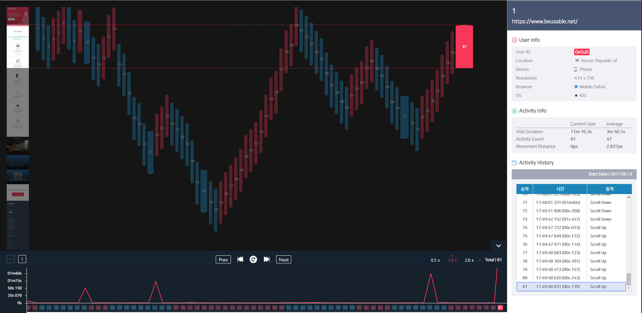 전체 사용자의 콘텐츠 소비 순서와 과정, 탐색 단계별 이탈 현황 및 체류 시간을 파악할 수 있는 Activity Stream 기능이 모바일 웹 분석에도 적용되었습니다. 화면 Touch, Swipe (Touchmove), Scroll 동작을 수집하여 평균적인 모바일 웹 사용자의 탐색 과정을 한눈에 볼 수 있습니다.
