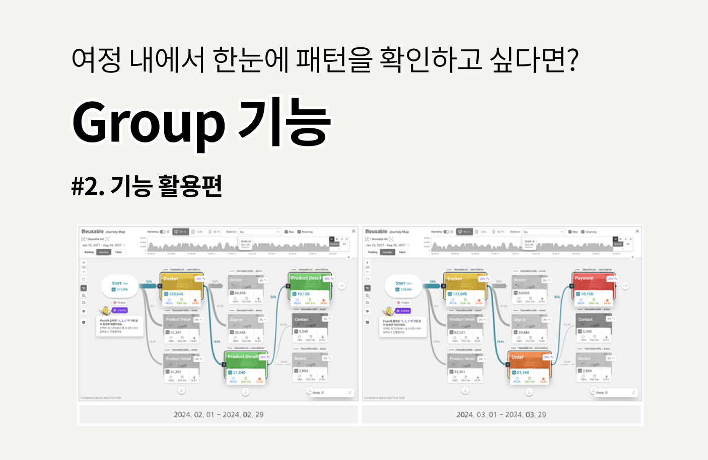 나아가 얼리어답터 고객이 누구인지를 발굴하여 서비스 개선에 지속적으로 활용해야 합니다. 하지만, 이러한 지표들은 ‘결괏값’에 해당할 뿐 어떤 경로를 통해 회원가입을 하였고 서비스를 이용하였는지 등에 대한 인과관계는 알 수 없기에, 뷰저블의 히트맵과 패스플롯 기능들을 병행 분석하여 원인을 파악하는 것이 좋습니다.