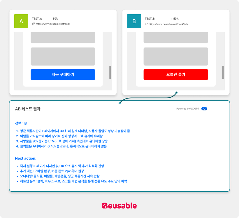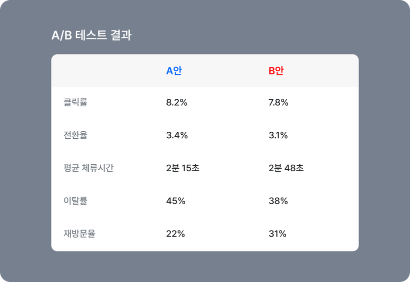 어느 쪽이 더 “좋다”고 단정짓기엔 클릭률은 A가 앞서고, 체류 시간과 재방문율은 B가 높았어요.