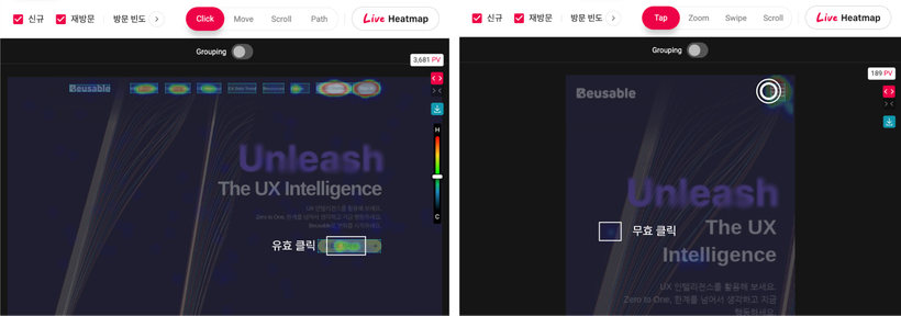 뷰저블의 클릭/탭 히트맵을 활용하면 유효 클릭과 무효 클릭을 모두 확인할 수 있기 때문에