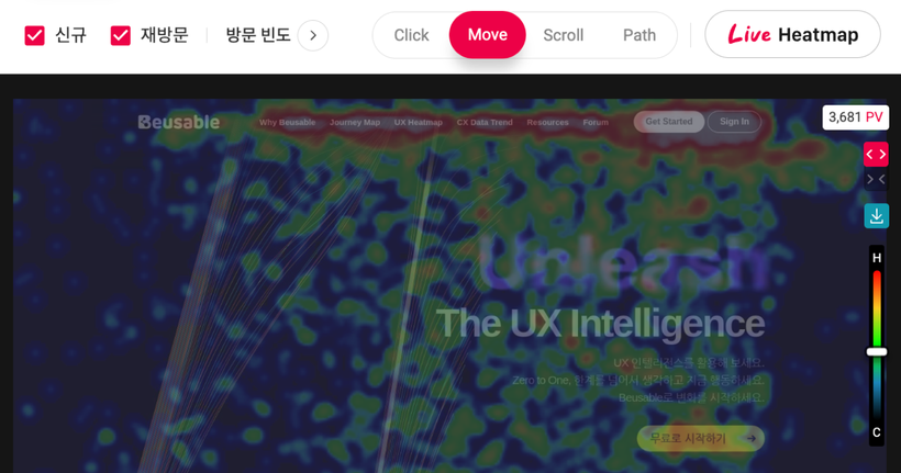 무브 히트맵은 사용자의 마우스 움직임을 시각화해서 보여줍니다.
