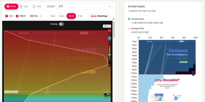 뷰저블은 사용자의 스크롤 도달률을 히트맵과 막대 그래프 형태로 제공하고 있는데요,