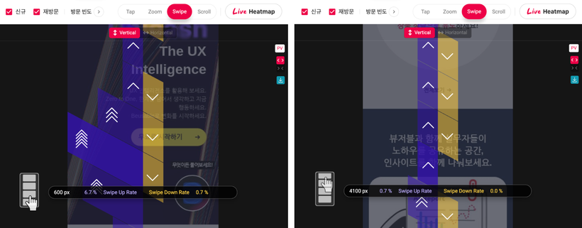 스와이프(vertical) 히트맵의 경우, 사용자의 스와이프 행동을 가늠해 볼 수 있는 데이터를 제공합니다.