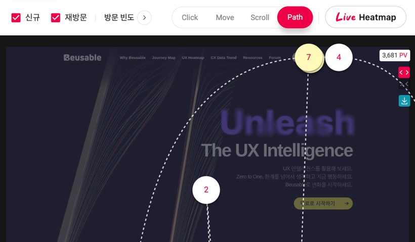 - 클릭+무브 히트맵: 관심과 전환(클릭) 사이의 관계 파악