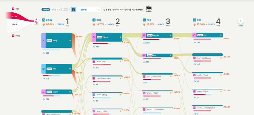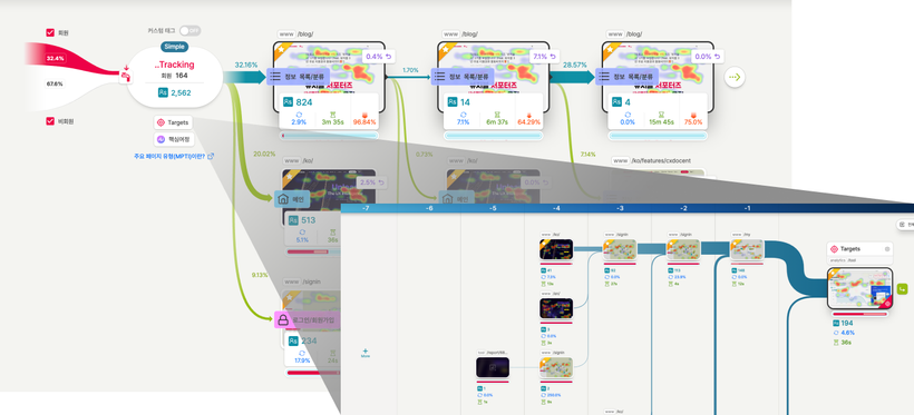 히트맵으로 개별 페이지의 데이터를 확인했다면, 저니맵 대시보드에서는 서비스 전체에 대한 지표를 알아볼 수 있습니다.