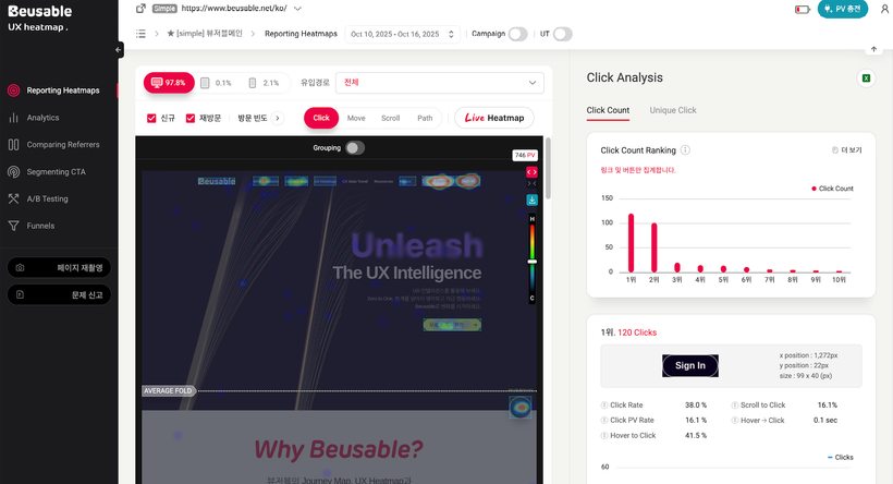 특정 페이지의 구체적인 고객 행동을 분석하고 싶다면 UX Heatmap(히트맵)을 추천드립니다.