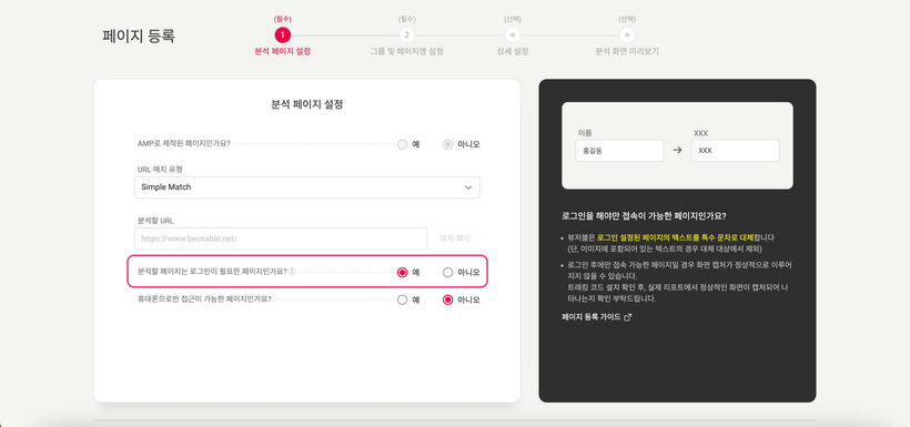 – 로그인 등 특정 값을 입력해야 접근할 수 있는 경우, 등록 시 ‘로그인이 필요한 페이지’로 설정해주세요.