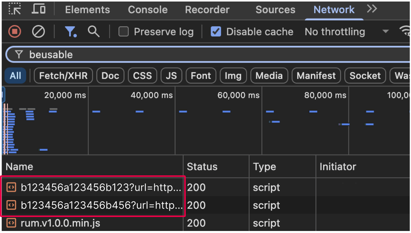 – 개발자 도구 실행(F12) > 네트워크 탭 이동 > 검색창에 ‘beusable’ 입력 > 리스트에서 트래킹 코드의 일련번호 확인