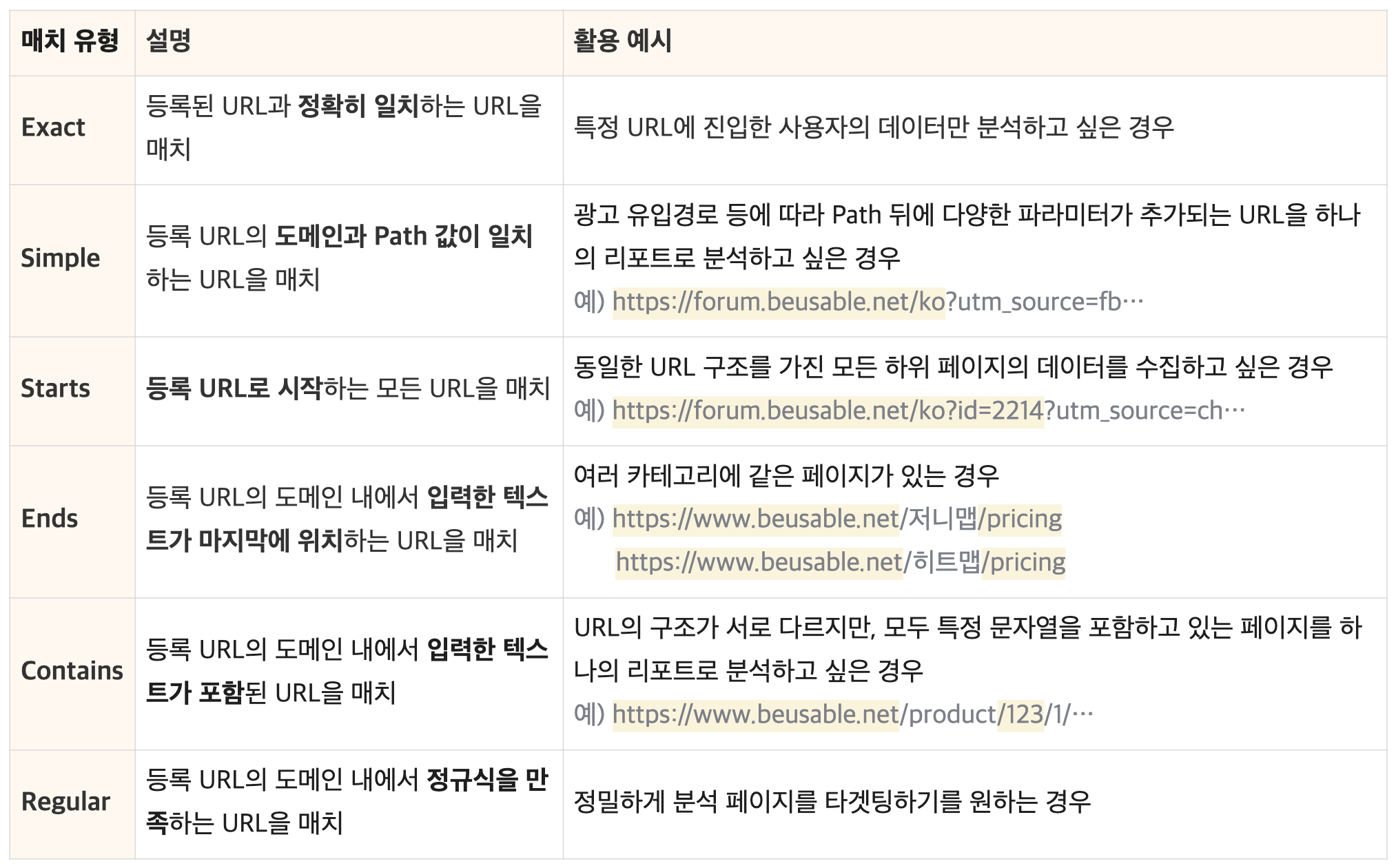 매치 유형이란, 특정 페이지의 분석 범위를 설정하는 기준을 말합니다.
