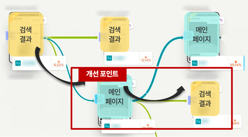 저니맵으로 살펴보니 검색 결과 페이지에서 메인 페이지로의 이동이 반복적으로 발견되었다고 하는데요,