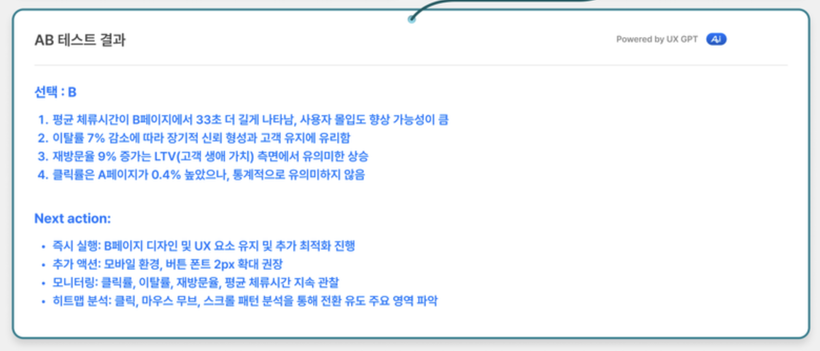 UX GPT는 A/B 테스트 결과를 빠르게 분석하고, 명확한 이유와 근거가 담긴 인사이트를 제시하며,