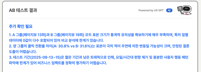 - • 한계: UX나 A/B 테스트 결과를 깊이 분석하는 데 필요한 전문 지표 해석이나 다음 행동 제안은 부족함