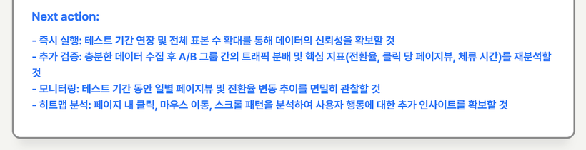 예) “테스트 기간 연장 및 표본 수 증가를 통한 충분한 데이터 확보”