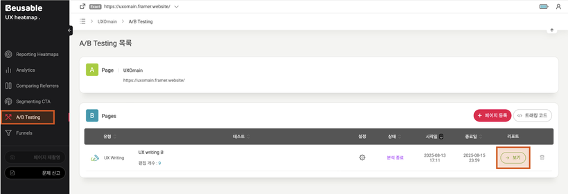 1️⃣ AB 테스트의 리포트 > 보기 버튼을 눌러 확인합니다.
