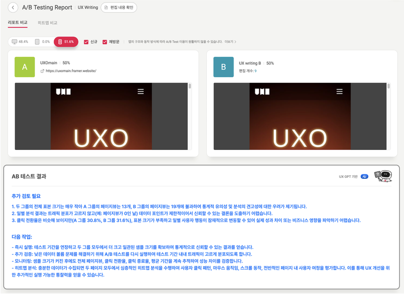 - • UX GPT: 추천 이유와 함께 즉시 실행·추가 검증·모니터링·히트맵 분석 등 구체적인 Next Action을 제시