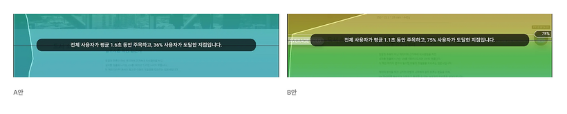 목표는 A안의 클릭 전환율인 81.8% 이상 달성이었는데, 아쉽게도 B안에서는 75%로 떨어졌어요. B안이 스크롤 도달률과 평균 체류시간에서는 우수했지만, 서비스에 대한 관심과 행동을 유도하는 데에는 A안이 더 효과적이었던 것으로 보입니다.