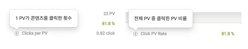 TIP. Clicks per PV, Click PV Rate? 지표가 헷갈린다면 ⓘ 표시에 마우스를 올려 쉽게 의미를 확인해보세요.