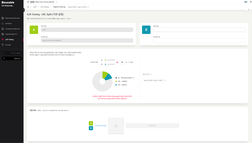 B안을 등록하는 과정에서 A/B Testing에 할당할 트래픽 비율 설정과 분석 기간을 설정했습니다. 나아가 전환 목표를 설정해, 단순히 페이지 내에서의 행동 지표 뿐 아니라 사용자가 다음 단계로 얼마나 이동했는지도 한눈에 확인하려고 해요.