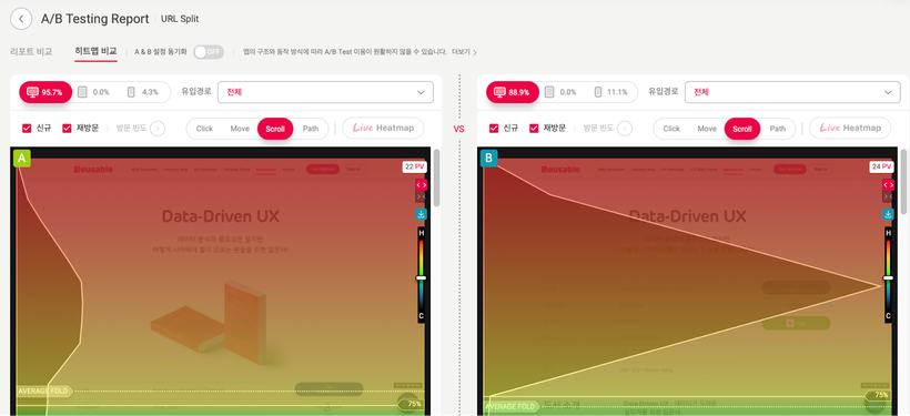 먼저 A안과 B안을 비교하기 위해 ‘히트맵 비교’ 기능을 활용했어요. 뷰저블은 Click, Move, Scroll, Path Plot 등 다양한 히트맵을 제공하고 있습니다. 이 중 핵심 콘텐츠까지 도달한 사용자 비율을 확인해야 하니까 스크롤 히트맵을 선택하고 구체적인 지표를 확인해볼게요.