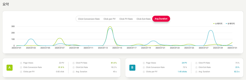 A/B 테스트 결과, B안의 평균 체류시간은 82.2초를 기록하며 목표치를 37% 초과 달성했습니다.