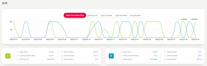 정리하자면, B안의 클릭은 정보를 찾지 못해 헤매는 ‘좌절’에 가까웠고, 그 결과 높은 이탈율로 이어졌습니다. 반대로 A안의 클릭은 만족스러운 정보 습득에서 출발해 서비스 전체를 탐험하는 ‘발견’의 여정이었습니다.