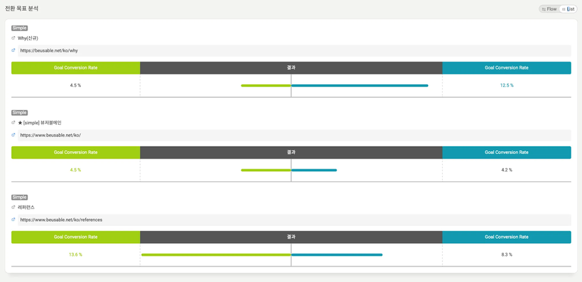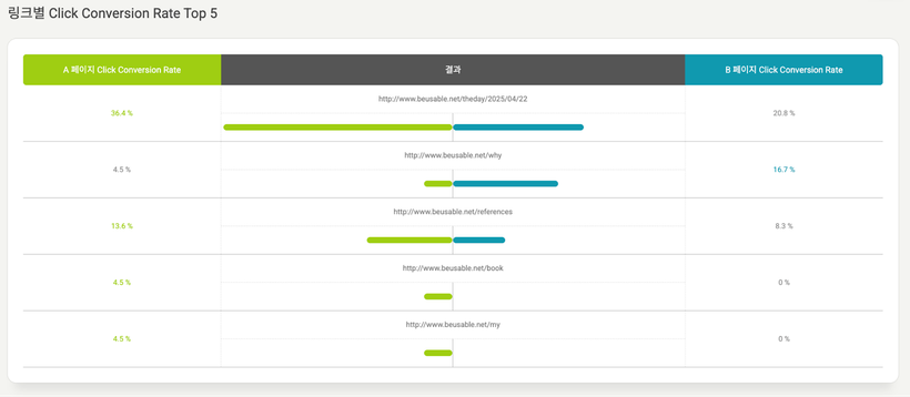 TIP. A/B 테스트를 설정할 때 등록한 전환 목표 페이지 별 실제 전환율을 한눈에 확인할 수 있어요.