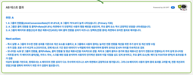 하지만 A/B Testing 리포트 상단에 위치한 UX GPT는 A안을 추천하고 있었어요.