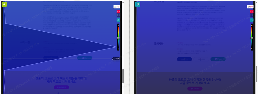 가장 먼저 스크롤 히트맵을 다시 열었습니다. 그리고 저는 제 눈을 의심할 수밖에 없었죠. B안의 평균 체류 시간이 길었음에도 불구하고, 페이지 최하단까지 스크롤을 내린 사용자는 오히려 A안이 훨씬 많았어요. B안 사용자 대부분은 페이지 상단에서 벗어나지 못하고 있었습니다.