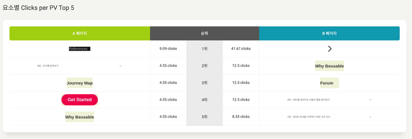 반면 A안 사용자들의 행동은 명쾌했습니다. Clicks per PV 상위 5개 항목을 보면 ‘References’, ‘Journey Map’ 등 플랫폼의 주요 탐색 요소들이 자리했습니다. A안 사용자들은 책에 대한 긍정적 인상을 바탕으로 서비스 전반에 대한 호기심을 키우며, 적극적으로 플랫폼을 탐색했어요.