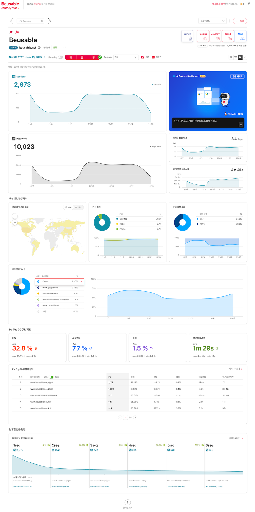 👉 뷰저블의 저니맵 대시보드는 단순한 수치 나열이 아니라, 사용자 여정에서 각 페이지별 문제 및 개선점을 파악하는 데 유용한 출발점이 됩니다. 이탈율, 체류시간 등의 지표를 통해 사용자 맥락을 이해하고, 콘텐츠와 서비스의 UX/UI 개선 방향 포인트를 잡아보세요.