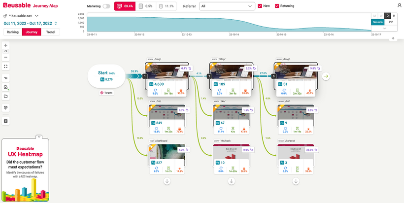 이렇듯 뷰저블 ‘저니맵 대시보드’에서는 고객의 사이트 이용 흐름을 데이터로 출력하여 시각화된 정보를 제공하고 있습니다. ‘복잡한’ 세팅이나 학습 필요없이 ‘스마트하게’ 고객 여정을 모니터링하고 시각화하여 최적의 고객 경험 설계를 디자이너 옆에서 언제나 보조하고 있습니다.