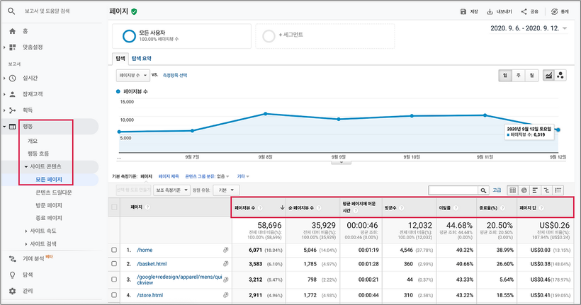 제일 먼저 보이는 화면은 세션과 페이지뷰인데요,