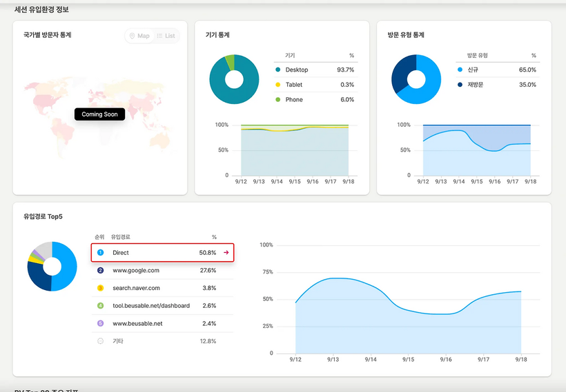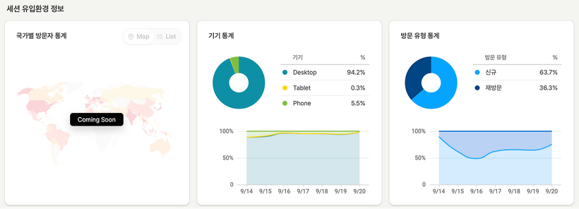 아쉽게도 아직 국가별 방문자 데이터가 제공되고 있지 않지만, 이 지표가 열리면 체류 시간과 함께 국가별 차이를 볼 수 있습니다. 국가별 방문자 통계가 중요한 이유는 방문자의 국적에 따라 콘텐츠 이해도와 체류 시간이 달라지기 때문인데요, 국내 사용자가 많으면 정보 이해도가 높아 체류 시간이 늘어날 수 있고, 해외 사용자가 늘어나면 언어 장벽 때문에 금방 이탈할 가능성이 있습니다.