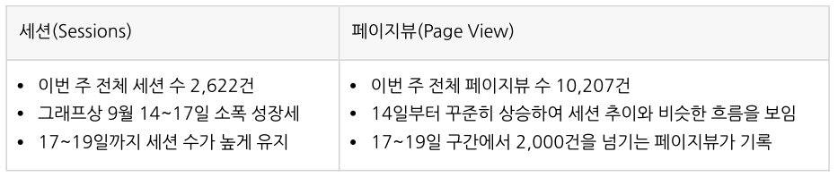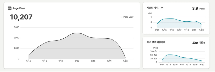 대시보드가 보여준 뷰저블 페이지의 세션 수와 페이지뷰를 확인해보니, 모두 같은 시점에 변동이 있었습니다. 17일 구간이 사용자의 관심을 끌었던 핵심 기간이었다고 할 수 있겠네요! 그런데 체류시간 같은 경우엔 큰 상승폭이 없었던 만큼, 체류시간을 늘릴만한 전략을 다시 설립해야 하겠습니다.
