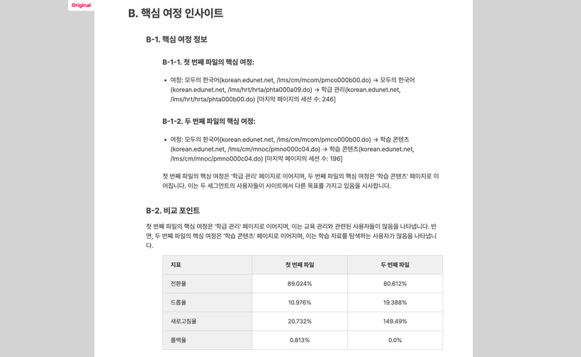 핵심 여정 Top 3를 비교한 결과 신규 방문자는 학습 콘텐츠를 이용하는 모습을, 재방문자는 학급 관리나 검사 현황 등 교사 위주의 패턴을 보인다는 것을 발견했습니다. 효율적으로 UX 인사이트를 얻기 위해 도슨트에 질문해봤습니다. 그 결과 학생들의 재방문율이 낮을 수 있다는 결론에 이르렀고, 학생 사용자의 초기 경험 강화와 재방문 유도 전략이 필요하다는 구체적인 개선 방향까지 얻을 수 있었습니다.