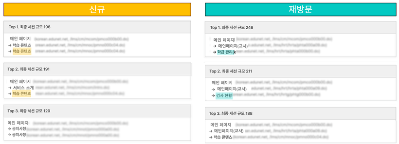 한 교육 플랫폼에서 신규/재방문 사용자의 탐색 패턴 차이를 비교하여 전략을 수립하고자 했습니다.