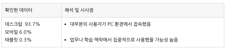 기기별 통계는 사용자가 어느 환경에서 콘텐츠에 집중하는가를 알 수 있습니다. 어떤 기기에 맞춰서 UX/UI를 중점적으로 설계할 지, 어떤 기기가 최적화가 부족한지 파악할 수 있습니다.