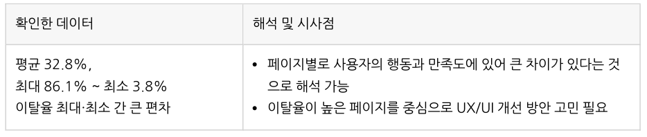 이탈율이 높게 나왔다는 말은, 사용자가 페이지 내 콘텐츠와 자신이 기대한 바가 달라 여정의 다음 단계로 자연스럽게 이어지지 못했다는 의미입니다.