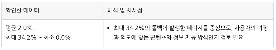 롤백 비율이 높다는 것은 일반적으로 사용자가 다음 단계로 이동했다가 해당 페이지에서 원하는 콘텐츠를 찾지 못해 되돌아갔다는 의미로 해석됩니다.