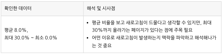 그러나 로딩 속도가 느리거나 오류가 발생해 답답함을 느끼고 페이지를 다시 불러오거나, 복잡한 UX/UI로 처음부터 탐색을 시도하기 위해 새로고침을 한다는 부정적 방향으로도 해석이 가능합니다.