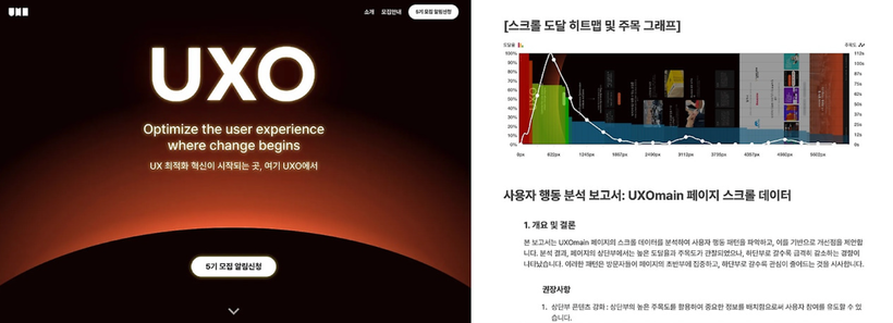 UX Heatmap으로는 스크롤 깊이와 클릭 위치를 파악해 ‘사용자들이 어디서 멈추고, 무엇을 눌렀는지’를 확인하고 있습니다. 특히, 스크롤 행동과 관련된 핵심 인사이트를 한 눈에 뽑아볼 수 있는 ‘스크롤 AI 리포트’ 기능을 유용하게 사용하고 있죠.