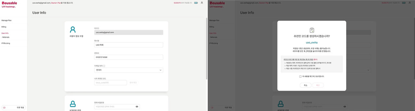 먼저, 다른 사람들에게 뷰저블을 추천하고 싶으시다면 개인 추천인 코드를 생성하시면 됩니다. 코드 생성 방법도 매우 쉬운데요, 뷰저블(https://www.beusable.net)에 로그인 후 User Info(사용자 정보)에서 발급이 가능합니다.