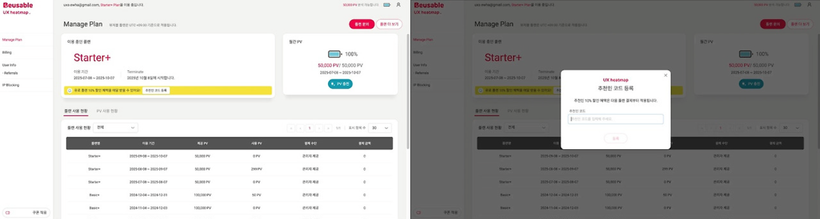 Manage Plan-이용 중인 플랜에서 ‘추천인 코드 등록’ 버튼을 통해 언제든 추천인 코드를 등록할 수 있습니다. 추천인 코드를 한 번 등록한 이후에 유료 플랜을 결제할 시, 매 결제마다 10%의 할인 혜택을 받을 수 있습니다.
