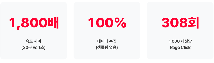 연구에 따르면 1,000 세션당 평균 308회의 Rage Click이 발생하며, 이는 깨진 버튼, 느린 응답, 또는 JavaScript 오류를 나타냅니다. 문제는 이러한 오류가 서버 로그에 나타나지 않는다는 것입니다.