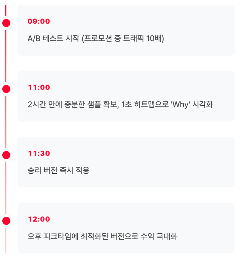 평상시라면 통계적 유의성 확보에 3~7일이 걸리지만, 트래픽 폭증 시에는 2시간 만에 충분한 샘플을 확보할 수 있습니다. 1초 히트맵으로 “왜” A안이 B안보다 나은지 즉각 시각화하여 이벤트 중 여러 번 최적화할 수 있습니다.