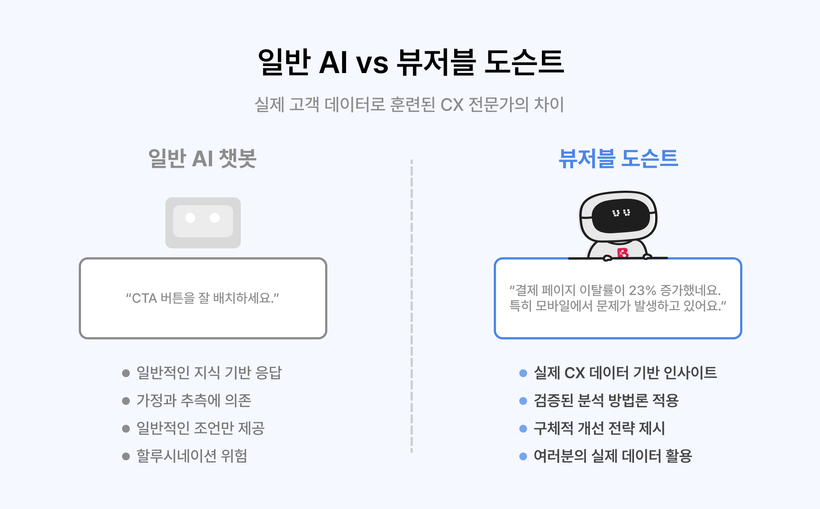 일반 AI는 “웹사이트의 전환율을 높이려면 CTA 버튼을 잘 배치하세요~”라는 뻔한 말을 하지만, 뷰저블 도슨트는 “지난주에 비해 결제 페이지에서 이탈률이 23% 증가했네요. 특히 모바일 사용자들이 신용카드 입력 단계에서 어려움을 겪는 것 같아요. 버튼 크기를 15% 키우고 단계를 간소화하는 것이 좋겠어요.” 이런 식으로 말한답니다.