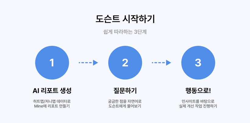 먼저 뷰저블의 히트맵과 저니맵 데이터로 CX AI 리포트를 만들어보세요. 도슨트는 이 리포트들을 ‘읽고’ 답변을 준비합니다.
