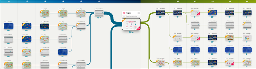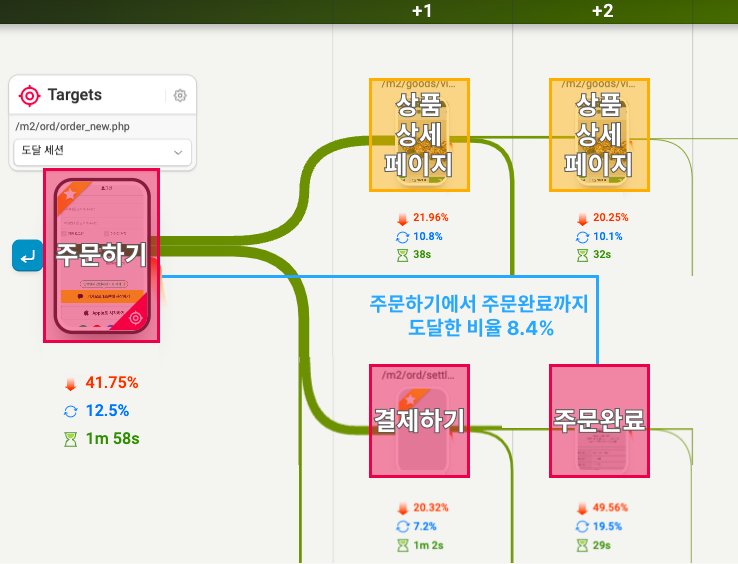 ‘Targets’은 뷰저블 Journey Map의 기능 중 하나로, 특정 페이지에 도달하는 여정과 해당 페이지 이후 사용자가 이동하는 경로를 보여줍니다.