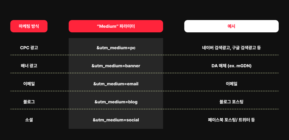 총 5가지 파라미터로 구성된 UTM을 통해 URL에 각기 다른 정보를 입력하면, 유입 채널, 캠페인, 키워드 등을 기반으로 사용자 데이터를 분석할 수 있습니다.