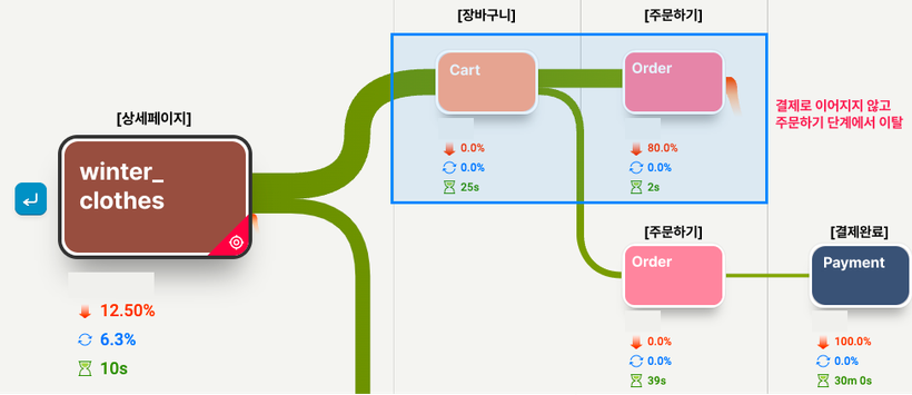 이 경우 고객은 장바구니에 상품을 추가했지만 주문 단계에서 결정을 미뤘다는 것을 짐작할 수 있으며, 복잡한 결제 과정, 추가 비용(배송비) 등을 이탈 이유로 생각해볼 수 있습니다.